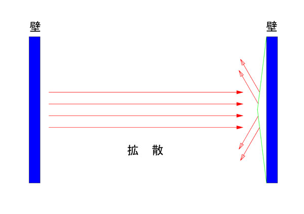 対策として並行面を無くし拡散するか片方を吸音することで防ぐことができる。特に一次反射音は音圧レベルが高く、直接音との時間差もわずかなために影響が大きいので対策が必要です。